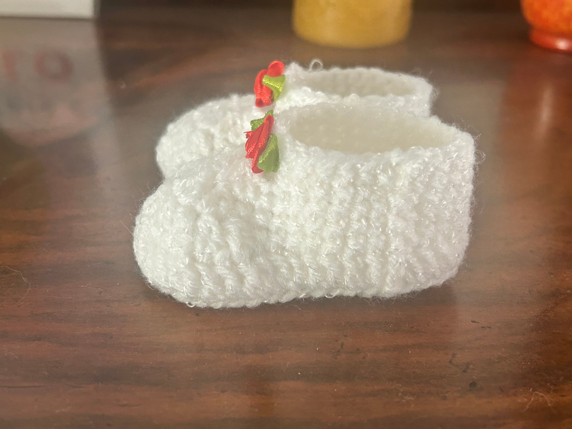 newborn baby shoes. DK yarn 100% Acrylic. Super soft with red rose application. Perfect for as a baby shower gift